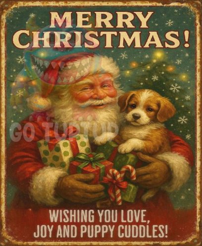 Vintage style Christmas metal wall sign features “Santa puppy cuddles” with a festive font.. Available in a weathered vintage look, that adds a rustic charm to any Christmas holiday decor. Set the Christmas mood, perfect for both kids and grown ups.